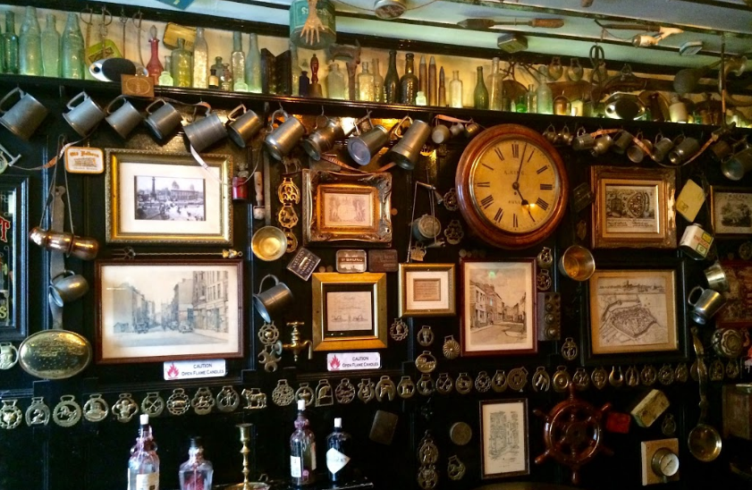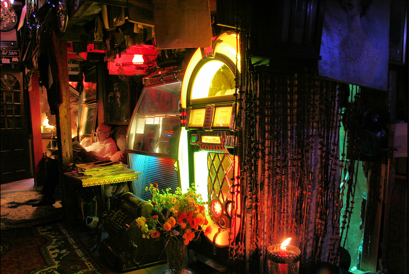 Naturally they have a gold fish, but expect to be diverted inside by the amazing assortment of other acquired objects which are plonked on, fastened-to, hung off, and draped over otherwise stately varnished wood, mirrors and glass panels. The eclecticism continues even into the bathroom with talking toilets and old portable televisions showing wildlife documentaries, and the bar menu scribbled onto a pack of playing cards tossed up into a lampshade.