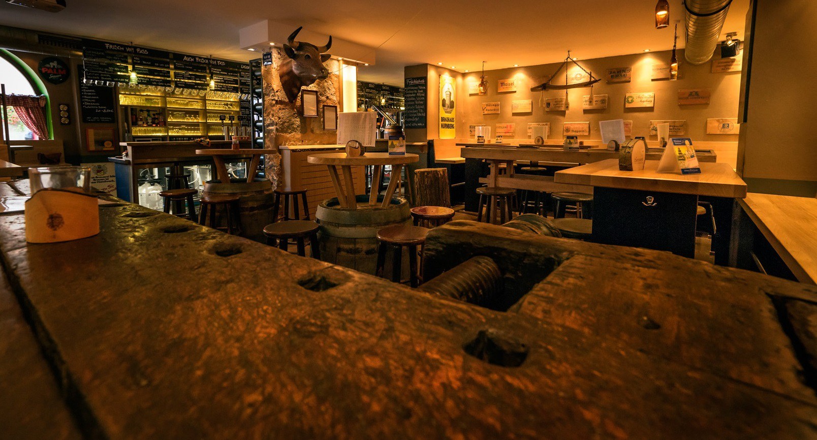 Once things get going itâs a fun venue, with a large tree trunk where you can play the ancient game of hammerschlagen, the objective being to drive a nail fully into the log with a wedge end of a hammer before the other players can. Thereâs also a hook-swing at the far end of the room where you have to try and get the hook over the horns of a bull on the other side. Both of these become fiendishly difficult after a few drinks.