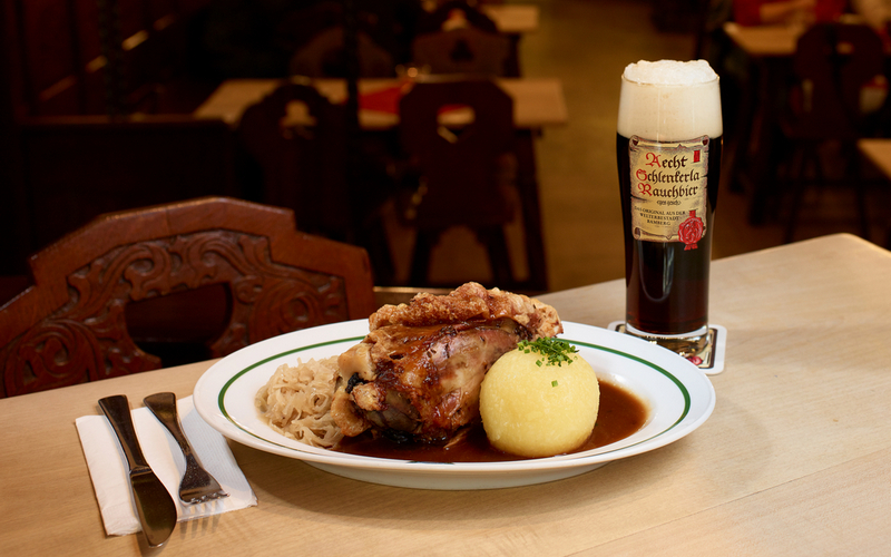Turn left as you enter the pub to find the Ausschenk (effectively the area geared for drinking over dining), and notice the Schlenkerla beer served gravity pulled direct from the barrel at the bar. The interior is black beamed, previously having been washed in ox blood (presumably for some superstitious reasons). Bamberg was one of the centres of witch trials in the middle ages and, similar to a few corners of Germany, does enjoy trading on its gruesome history. The room itself feels like it has transported you hundreds of years ago save perhaps for certain added sounds and smells.